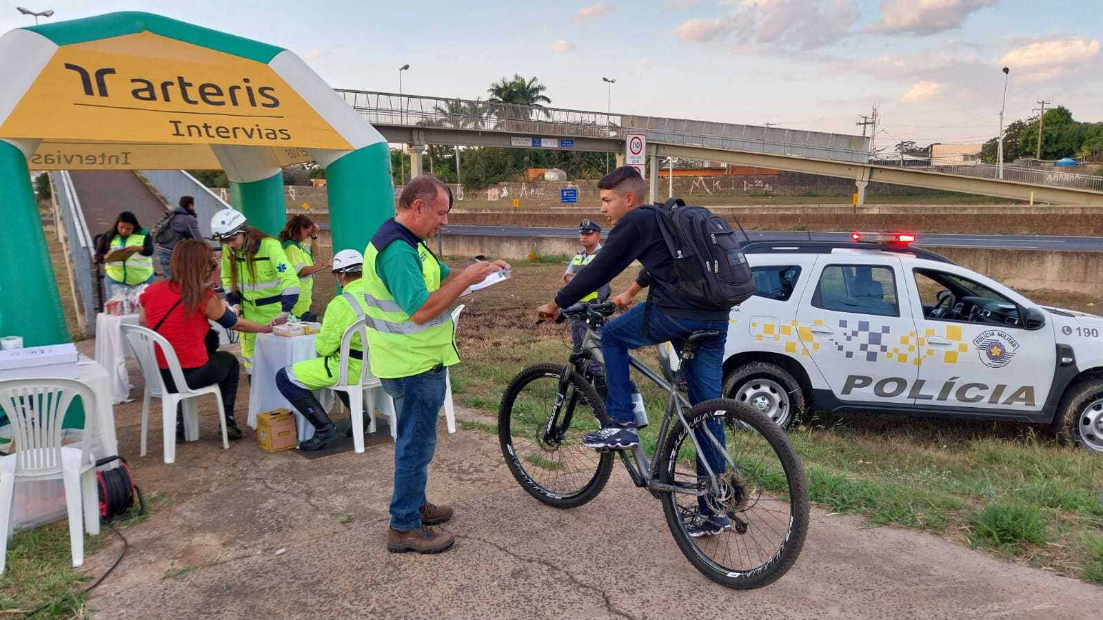 A Arteris Intervias promoveu ação especial nesta quinta-feira (07/08) para reforçar a importância da utilização das passarelas para a travessia segura de ciclistas nas rodovias.