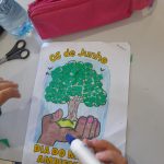 Atividade de meio ambiente, com pintura e colagem de E.V. A. no desenho, conversa sobre quais são os cuidados que devemos ter para preservar as plantas.