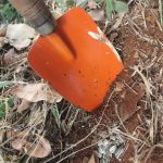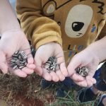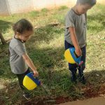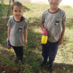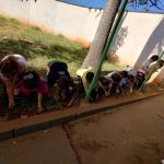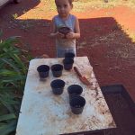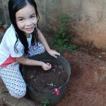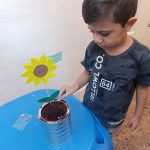 Criança plantando sementes de girassóis que foram dadas na escolaem casa