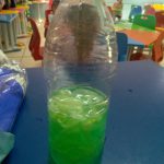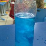 Desenvolvimento: Em uma roda de conversa com auxílio de alguns materiais, foi demonstrado para as crianças como a água se transforma (com um algodão, foi demonstrada a nuvem quando chove, foi explicado que ao cair no solo a água vai para os rios e molha a terra, e que com o sol as gotas da chuva viram vapor igual a água quando vai ao fogo para fazer café ou cozinhar o arroz). As crianças então, entenderam que a água volta para a nuvem como “vaporzinho” e junta-se com outras gotinhas até cair como chuva outra vez. Foi demostrado que a água quando está em um lugar muito frio fica durinha, formando gelo, e que quando colocamos nos alimentos e levamos ao fogo ela os transforma com o cozimento. Após isso, foi explicado que a água move máquinas com sua força em fábricas e que também é responsável por outras transformações, então as crianças fizeram o experimento com as garrafas pet, água e papel crepom, transformando as cores na água (juntando o amarelo e o azul formando o verde).