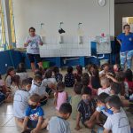 Onde todos iam interagindo de acordo com a história que falava de todos os processos da água ficamos no pátio a primeira aula para todos compartilhar seus conhecimentos.