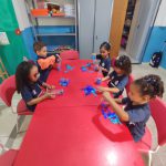 Após esse primeiro momento propôs as crianças fazer uma experiência com água magica, utilizamos garrafas pet; papel crepom; lápis de cor; desenho da gotinha impressa; e água.