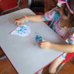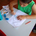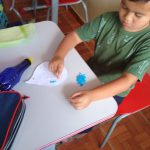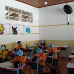 Após a conversa, os alunos fizeram recortes, colagem e pintura, confeccionaram a máscara e o pingente dos  guardiões da água.