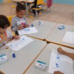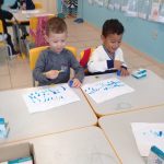 Crianças usam tinta guache para reproduzirem a chuva.