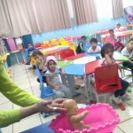 Desenvolvimento: Através de uma roda de conversa, foi explicado para as crianças que a higiene nos mantém sempre saudáveis. Assim como devemos manter a nossa casa, escola e objetos de uso sempre limpos, também devemos cuidar de nossa higiene corporal. Água e sabão são essenciais para nossa higiene. Em desenhos de rostos e mãos dentro de um plástico (folha plástica para pasta), desenhamos com canetinha: sujeira no rosto e nas mãos, unhas sujas, molho na boca, piolhos nos cabelos… e, então, cada criança fez a assepsia com lenços umedecidos em água e sabão, passando por cima do plástico e limpando as cabeças, rostos e mãos. Também foi utilizado uma boneca para demonstrar a higiene corporal através do banho e, estimulando assim, as crianças a fazerem a higiene pessoal.