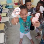 Os alunos pintaram algumas placas, colocamos no palitinho e levaram para casa.