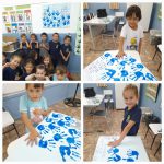” Preservar a água está em nossas …”, foi pintado com tinta guache azul as mãos dos alunos, para representar as gotas de água e carimbado no cartaz.