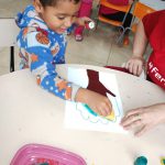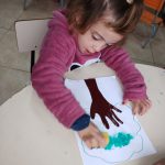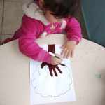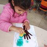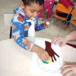 Trabalhamos desenhando a mão e formando uma árvore com as próprias mãos e colorindo com esponja na copa da árvore. Com o objetivo de explorar as possibilidades de criação usando a tinta e as mãos, reconhecendo melhor as partes do corpo. Aprimorar a percepção de cores, texturas e movimento.