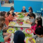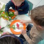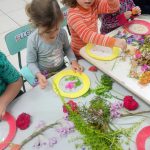 Com o circulo que pintamos na aula anterior colamos folhas e flores montando um quadro para levar para casa.