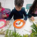 Pedimos previamente aos pais que enviassem flores, folhas para a realização desta atividade, exploramos o cheiro das flores, texturas e cores.