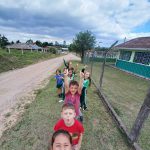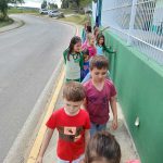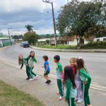 Os alunos do Primeiro Ano realizaram um passeio ao redor da escola para observar o trânsito e o espaço que a escola se encontra. Durante a caminhada, perceberam que vivem em uma zona rural, onde há ruas asfaltadas e ruas de terra, poucas placas de sinalização e ao redor da nossa escola há apenas três faixas de pedestre. Apesar de a região não ser muito movimentada, compreenderam a importância de prestar atenção e ter cuidado ao atravessar a rua. Perceberam também a natureza que cerca a nossa escola.
