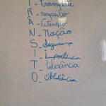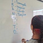 Durante a aula, realizamos uma atividade de produção coletiva em que as crianças escreveram um acróstico na lousa utilizando a palavra “TRÂNSITO”. Cada letra foi associada a uma palavra relacionada ao tema, escolhida pelos próprios alunos.