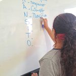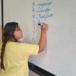 Além disso, a escrita no quadro permitiu que os alunos exercitassem leitura, ortografia, organização de ideias e colaboração.