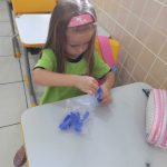 Realizou experiência em sala com a travessa de vidro e um sapo de brinquedo dentro em água limpa, depois foi colocando papel sujo, café, canudos, até sujá-la.