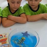 Rasgar papel crepom e colocar num pacotinho transparente para simular um “mini aquário”.