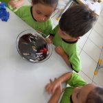 Realizou experiência em sala com a travessa de vidro e um sapo de brinquedo dentro em água limpa, depois foi colocando papel sujo, café, canudos, até sujá-la.
