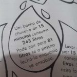 Atividade (xerox) para ler e refletir sobre a quantidade de água (L) gasta com a torneira aberta: lavar roupas, escovar os dentes, tomar banho e lavar louça.