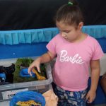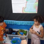 Depois as crianças interagiram com o ambiente limpo e conservado, com os animais/brinquedos, que estavam bebendo água boa e morando felizes nesse ambiente. E explicaram a diferença dos ambientes artificias e a importância da água para a sobrevivência das plantas, animais e seres humanos.