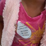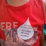 Crachá de conscientização com pintura, recorte: “Eu cuido de cada gotinha”.