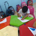 Em sala fizemos uma roda de conversa e conversamos sobre a água e suas utilidades, sua importância na natureza e nas nossas vidas. Em seguida, foi dada uma viseira para cada um pintar, representando a gotinha d’ água. Através dessa atividade, puderam entender também sobre o seu uso consciente e a sua preservação. Foi uma atividade bem gostosa de realizar.