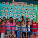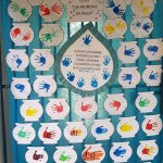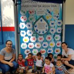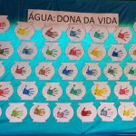 METOLOGIA: No pátio da escola foi feito uma brincadeira com mímica, na qual os alunos deveriam descobrir o que significava o gesto a professora estava fazendo (tomando banho, escovando os dentes, tomando água, nadando, etc…). Em seguida foi explanado que todas essas coisas só são possíveis de serem feitas com água e água limpa, inclusive para os animais e plantas, por isso é preciso cuidar, tanto do lixo que deve ser descartado em local adequado, nunca jogando nas ruas e também não desperdiçando, economizando água em tudo que fazemos em casa e na escola: banho, descarga do banheiro, limpeza da casa e carros… foram citados vários exemplos e as crianças foram muito participativas. Cantamos a música “Peixe Vivo” e foram realizadas atividades de carimbo com as mãos para montagem de um painel.