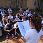 Após assistirem um vídeo sobre o meio ambiente, com foco nos recursos naturais. Foi proposto como tarefa que eles fizessem uma redação contando sobre ideias que tiveram para ajudar a salvar o meio ambiente no seu próprio cotidiano. No outro dia, sentados à sombra de alguns coqueiros no jardim, cada um pode ler sua redação para os colegas.