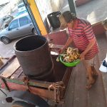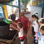 Após saborearem a salada de frutas, os alunos receberam na escola um senhor que recolhe lavagem para levar aos seus animais no sítio e depositaram em seu barril as cascas das frutas que coletaram em sala.