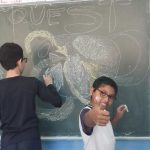 O professor Eduardo Basílio Ribeiro, professor de Português dos 6º anos, realizou atividade de leitura e interpretação da história em quadrinho do Zé Quest, Revistinha 2018, com as turmas 6º A e B. Inicialmente, o professor apresentou a revistinha para as turmas, falou sobre a turma do Zé Quest, promoveu uma discussão sobre o trânsito e os conhecimentos que a turma já possuía e a partir daí propôs a leitura da história “Apelos contra atropelos”. Os alunos fizeram a leitura dramatizada e gostaram muito. Gastaram uma aula só na leitura, tornando esse momento prazeroso para todos. Após a leitura, o professor apresentou perguntas relativas ao texto para responderem oralmente e depois por escrito e todos se empenharam, principalmente nas questões orais. Todos queriam falar!!! A última etapa da atividade proposta ficou para a arte: ilustração da história ou do tema em pauta que é a conscientização dos cuidados que se deve observar para ter um trânsito seguro e sem acidentes. os alunos fizeram ilustrações no caderno e em folhas separadas para produção de cartazes e houve até alguns alunos que pediram ao professor para fazer desenhos no quadro de giz. O professor se deixou contagiar pelo entusiasmo dos alunos e abriu espaço para o desenho no quadro. A atividade durou toda a semana, e durante a realização da atividade, muito se falou sobre o maio amarelo, o que é, porque foi criado e também sobre o tema desse ano.