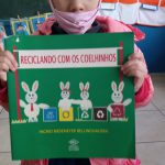 Através de uma história divertida e informativa, as crianças conheceram mais sobre a coleta seletiva, o personagem da história ( coelhinho), mostrou de maneira lúdico, as caixas seletivas e o que podemos reciclar e assim ajudar cuidar do nosso planeta! Após a leitura e conversa, as crianças realizaram uma atividade, relacionada ao tema reciclagem!