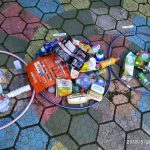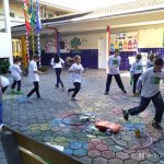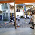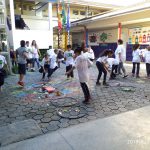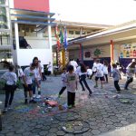 Juntamente com as professoras do Monitorando os Rios pela Educação Ambiental no Rio Cachoeira – Univille, colocaram bambolês, com palavras indicando as cores, posteriormente, buscaram os lixos que haviam sido espalhados e colocaram dentro de cada cor.