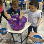 Juntamos tampinhas de refrigerante, os alunos ficaram com a responsabilidade de juntar. Com as tampinhas em mãos criamos um jogo bem divertido, uma pescaria de tampinhas.