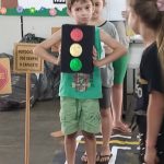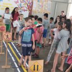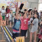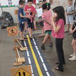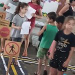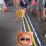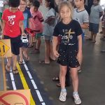 As crianças fizeram o trajeto com uma pista no chão.