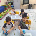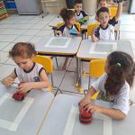 Dentro do Projeto de números e Formas, os alunos do Maternal II, os alunos exploraram o quadrado e brincaram com carrinhos, seguindo o circuito. Conforme os comandos do semáforo (vermelho, amarelo ou verde), iam parando, prestando atenção e seguiam, conforme as respectivas cores ditadas pela professora.