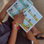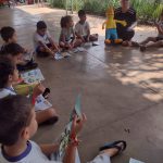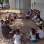 Em uma roda de conversa, a professora apresentou a revista do Zé Quest 2023 para que as crianças pudessem fazer uma leitura de imagens da história “Pedras no caminho”.