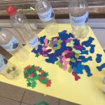 Cada criança escolheu os materiais (peixinhos e estrelas de EVA, lantejoulas e glitter) para colocar dentro da garrafa. Desta forma, trabalhou-se interdisciplinarmente com conteúdos matemáticos no que diz respeito a números e quantidades, estabelecidas pelo professor. Finalizada esta etapa, no pátio da escola, as crianças encheram as garrafas com água transformando-a em um lindo aquário.