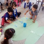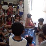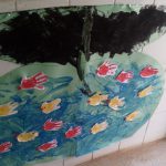 Carimbando as mãos, as criancas construíram um aquário bem grande e colocaram em exposição na sala. Eles amaram e até mesmo relataram experiências com peixes reais, enfatizando os cuidados e o carinho que este pequeno ser exige.