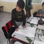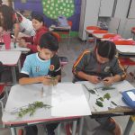 Os alunos reuniram-se em grupos e fizeram a coleta de algumas folhas e outros elementos na natureza,  buscando por aqueles que estavam caídos pelo chão,  tendo consciência da preservação do meio ambiente.