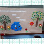 Desenvolvimento: Trouxe uma caixa com materiais recicláveis para a sala de aula, dentre os objetos muitas tampinhas com cores, formas e tamanhos diferentes. Começamos separando as tampinhas pela cor e pelo material, tínhamos tampinhas de metal e de plástico. Enquanto as crianças formavam sobre a mesa uma copa de árvore com tampinhas eu colava no cartaz. As crianças pediram para fazer um lago para por peixinhos, flores e assim montamos a nossa paisagem.