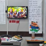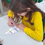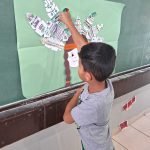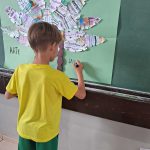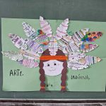 Alunos do 2 ano A, após as atividades na sala, construíram um cartaz sobre a arte indígena, lembrando as cores, formas e utensílio cocar usado na cabeça no seu dia a dia e em cerimônias.