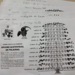 Em seguida, entreguei a folha com a atividade 3- Árvore Sustentável de Palavras e fomos descobrindo as palavras que respondiam às questões coletivamente. A cada palavra descoberta, falávamos sobre o seu significado e sua relação com a sustentabilidade.