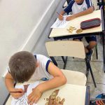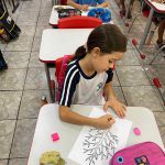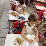 Após a conversa, as crianças participaram de um passeio pelos espaços da escola, observando as árvores do entorno e coletando algumas folhas que haviam caído. Em seguida, no retorno à sala de aula, os alunos utilizaram as folhas coletadas para realizar uma atividade artística, colando-as e registrando o que aprenderam sobre a importância das árvores para o meio ambiente.