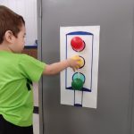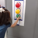 Após uma  conversa sobre a semana do trânsito e a importância de sermos sempre prudentes sendo motoristas ou pedestres,  mostrei imagens de semáforos através do celular e fiz uma breve explicação da importância desse instrumento para o funcionamento seguro do nosso trânsito. Então, ofereci bolinhas nas cores do semáforo e eles colavam nos seus respectivos lugares.