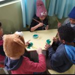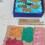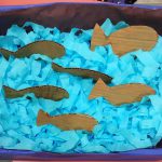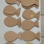 Os peixinhos foram confeccionados com uma caixa de água sanitária que seria descartado no lixo, foi pintada com tinta guache e depois decoradas a gosto de cada um.