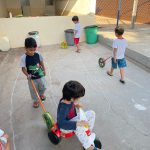 Desenvolvimento: Na integração, aproveitamos para conversar com todos os alunos sobre a faixa de pedestre, placas, cinto de segurança, semáforo de carros e de pedestres. Em seguida apresentamos uma atividade lúdica, um circuito para colocarmos em prática a conversa realizada. Distribuímos brinquedos (velotrol, rodas e cavalinhos). Explicamos a atividade do circuito, como acontece na rua, eles prontamente pegaram seus objetos e olharam a sinalização para poder circular pelo trânsito. Quando o semáforo de carros estava vermelho, ficavam parados aguardando a mudança, respeitavam o pare para os outros passarem bem como a faixa de pedestre quando o amigo estava passando, entendendo a proposta da atividade.
