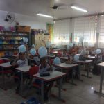 Por se tratar de turmas de alfabetização foi feito um acróstico com a palavra água e entregue bexigas simbolizando a gota d’água com panfletos de conscientização da família.