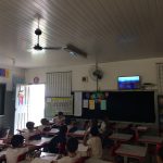 As professoras apresentaram dados sobre a quantidade de agua doce no planeta, a questão da poluição, e do desperdício doméstico em atividades do cotidiano.