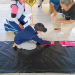 Montagem de um circuito simulado com placas e faixas de pedestre para a vivência prática.