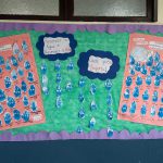 Ela trabalhou vídeo interativo, explicações e experiências. Recorte e colagem com revistas e desenhos. Montaram painel com os desenhos das gotinhas de água, tão essenciais na natureza.