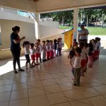 No pátio fizemos duas colunas ficando uma criança na ponta com um avental de semáforo junto com um policial rodoviário. Nisso foi colocado a música da Xuxa: Atravessar a rua, no qual as crianças passavam de um lado para o outro, representando o que a música pedia. Foi uma atividade educativa e divertida.