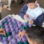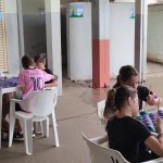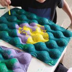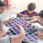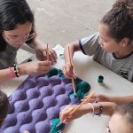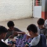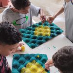 Trabalhando o dia da Independência do Brasil e reciclando : usando as bases de papelão que vem as frutas, as crianças, agrupadas na hora livre se organizaram para reproduzir nossa bandeira.